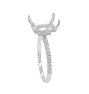 18kt white gold 4 prong emerald under-halo semi-mount with micro prong set round brilliant diamond on the gallery and shank.