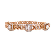 18kt rose gold micro prong and invisible set baguette and round brilliant diamond multi-cluster link bangle.