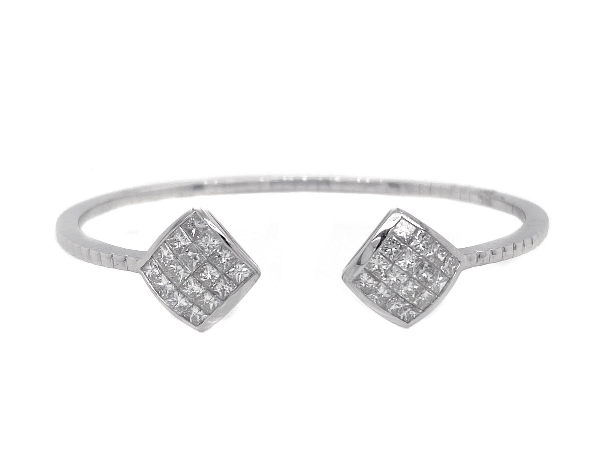 18kt white gold invisible set princess cut diamond double cluster open bangle.