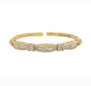 18kt yellow gold micro prong set round brilliant diamond and channel set baguette diamond flex bangle.