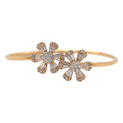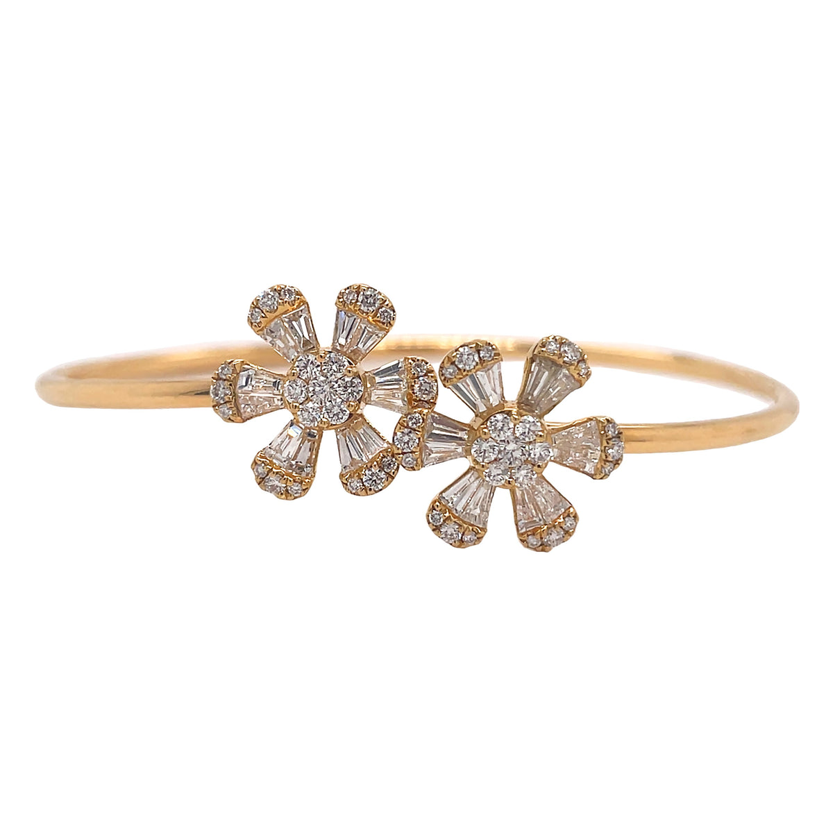 18kt yellow gold micro prong set baguette and round brilliant diamond double flower flex bangle.