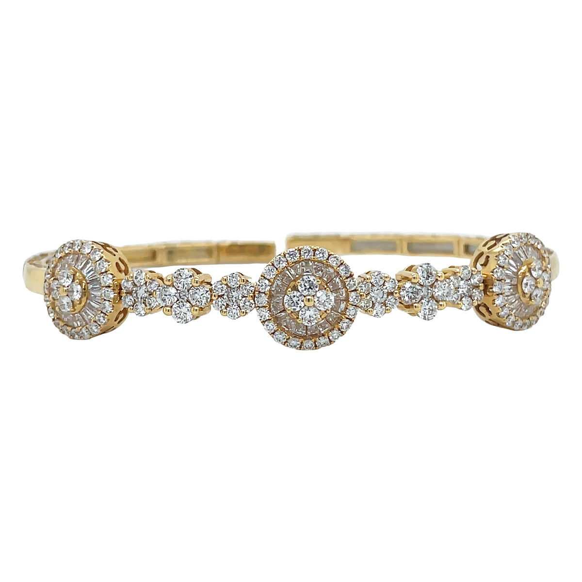 18kt yellow gold prong set round brilliant diamond and channel set baguette diamond round multi-cluster bangle.