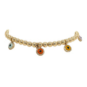 14kt yellow gold micro prong set round brilliant diamond dangling evil-eye stretchy bracelet.