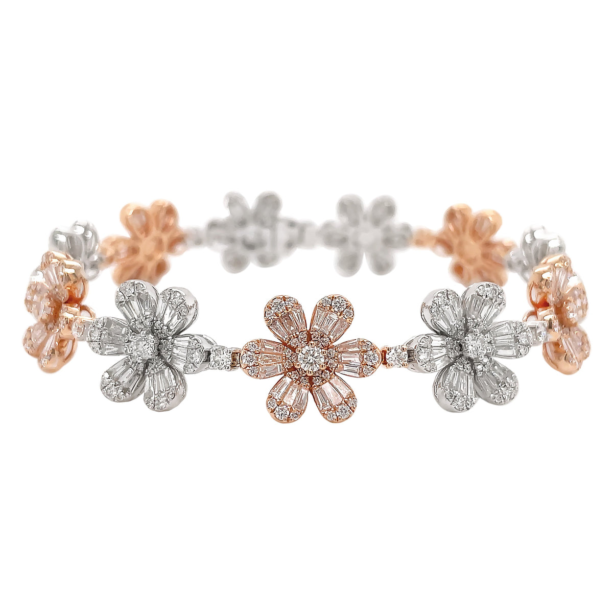 18kt white and rose gold micro prong set baguette and round brilliant diamond multi-cluster flower bracelet.