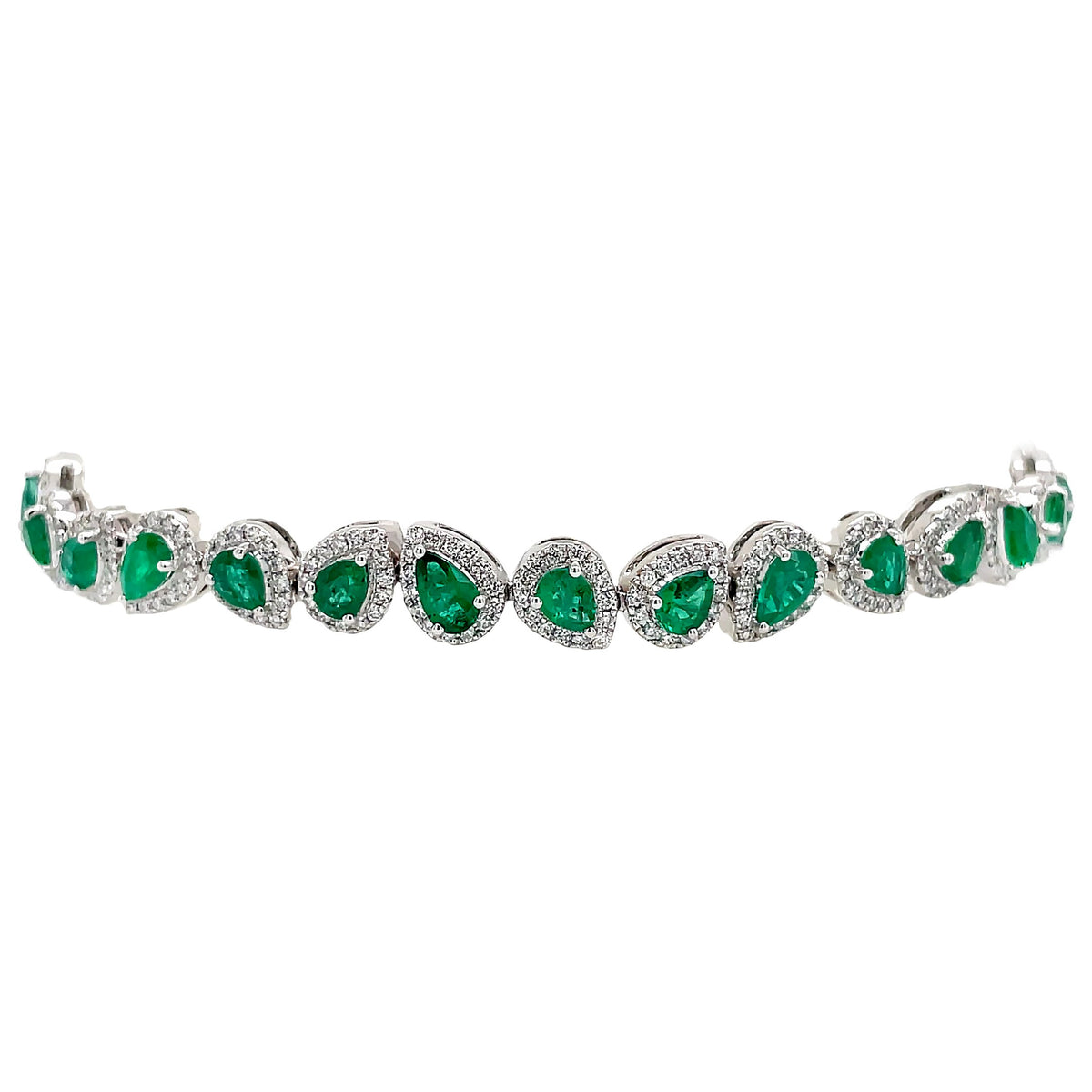 18kt white gold 3 prong set green emerald and micro prong set round brilliant diamond multi-cluster tennis bracelet. 29 green emeralds = 4.99ctw 416 round diamonds = 1.61ctw Length: 7"