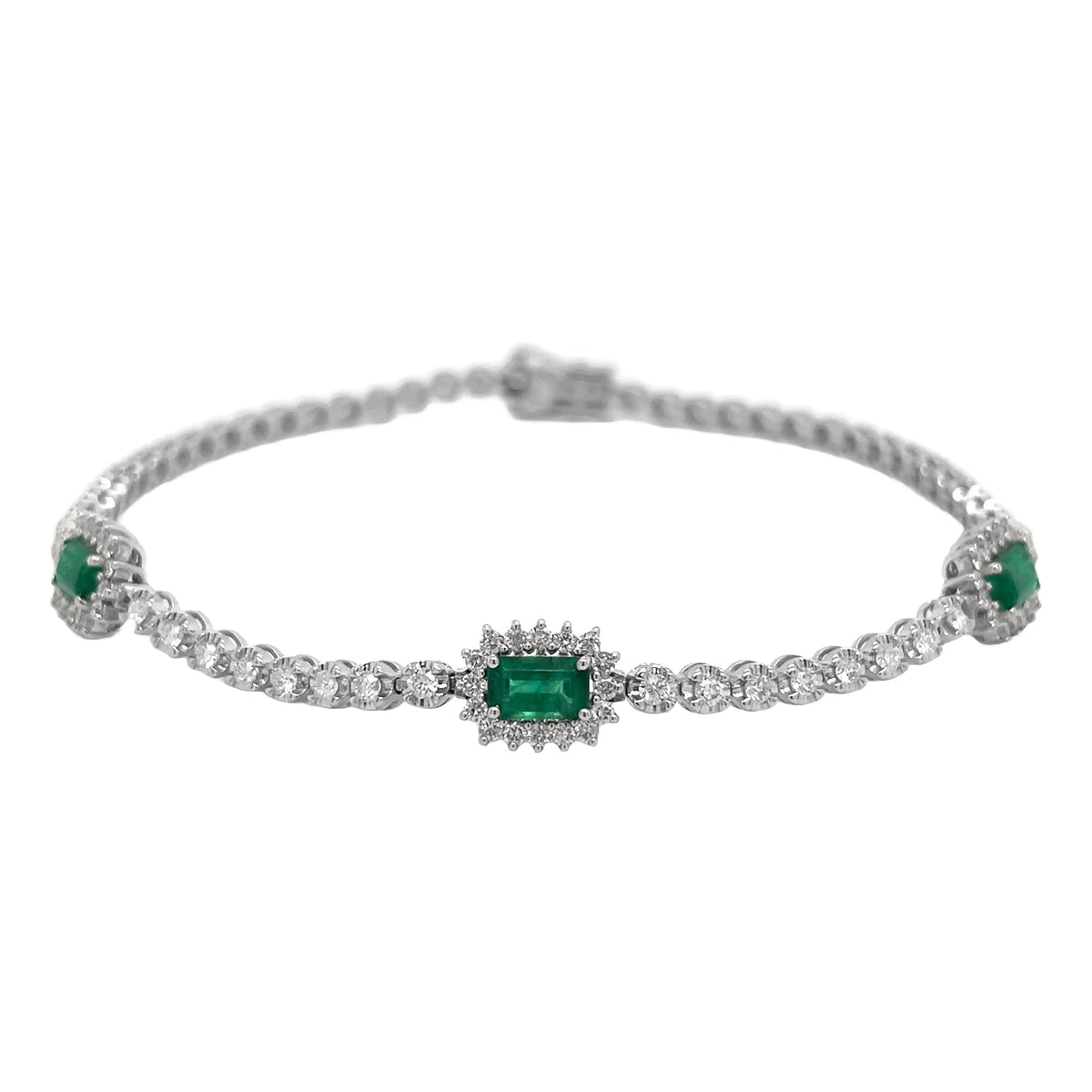 18kt white gold 4 prong set and round brilliant diamond and green emerald multi-cluster tennis bracelet. 3 green emeralds = 0.78ctw 104 round diamonds = 1.17ctw Length: 7"
