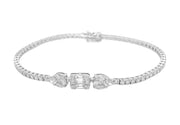 18kt white gold 4 prong and invisible set baguette, pear, princess, marquise and round brilliant diamond multi-cluster bracelet.