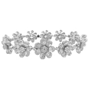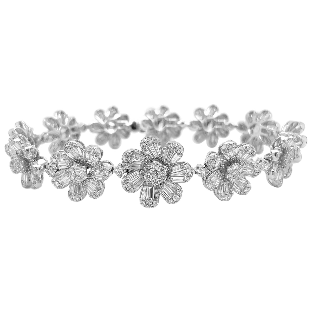 18kt white gold channel set baguette and prong set round brilliant diamond multi-cluster graduating flower bracelet.