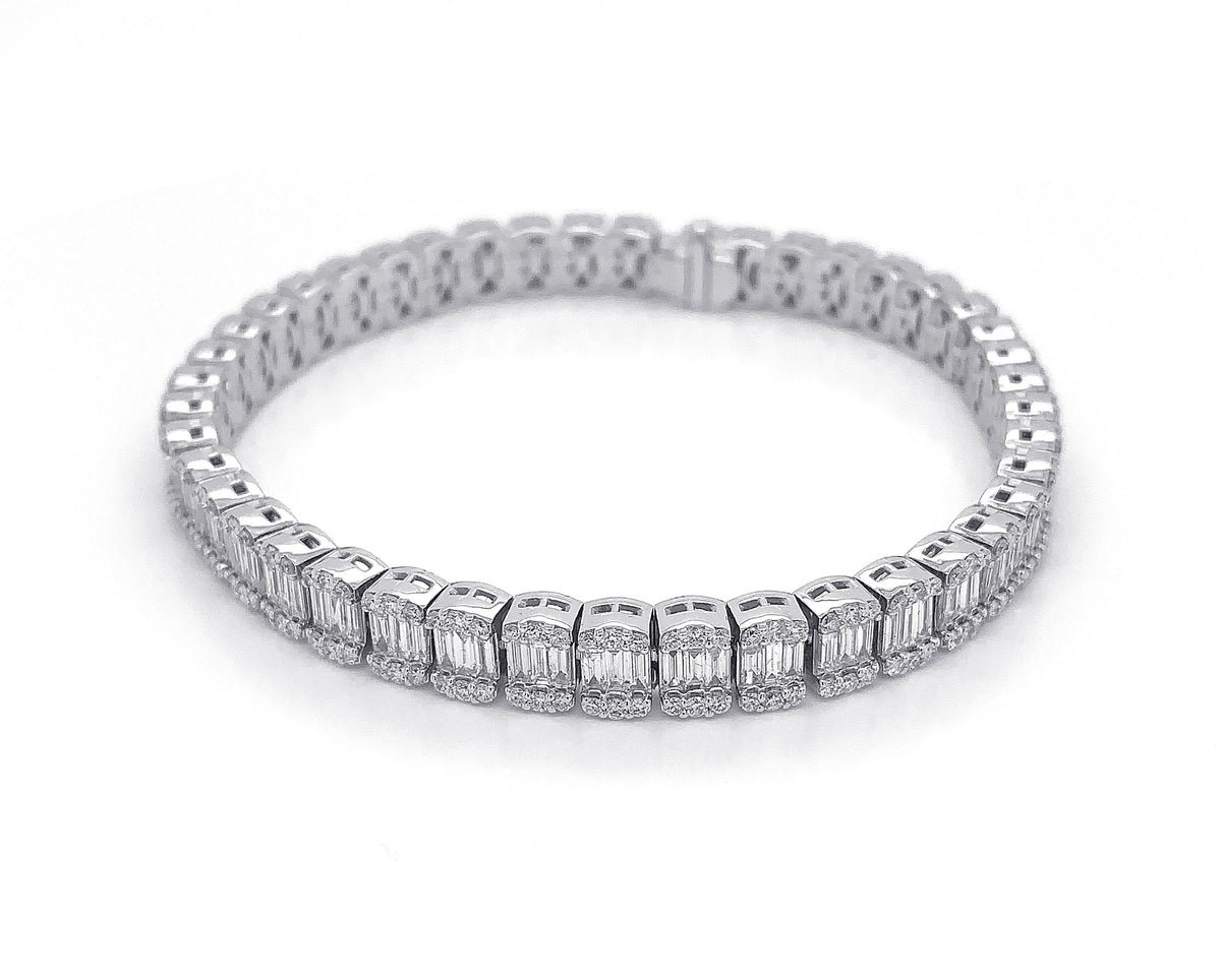 18kt white gold micro prong set round brilliant diamond and channel set baguette diamond tennis bracelet.