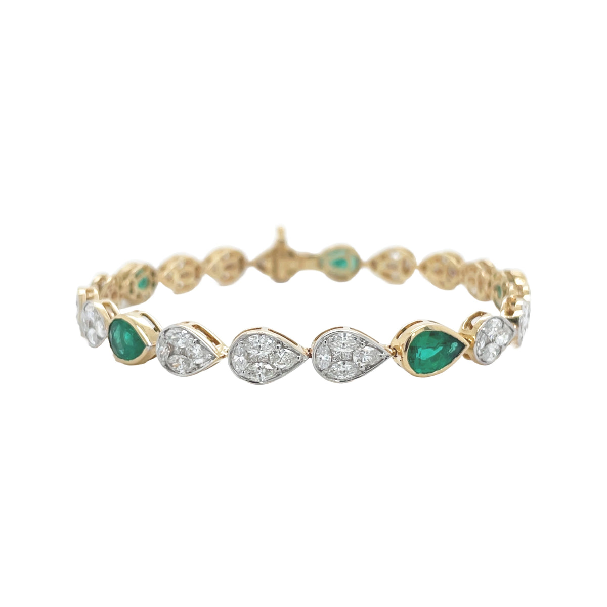 18kt yellow and white gold bezel set green emerald and invisible set marquise, pear and princess cut diamond multi-cluster bracelet. 90 diamonds = 3.70ctw 5 green emeralds = 3.50ctw