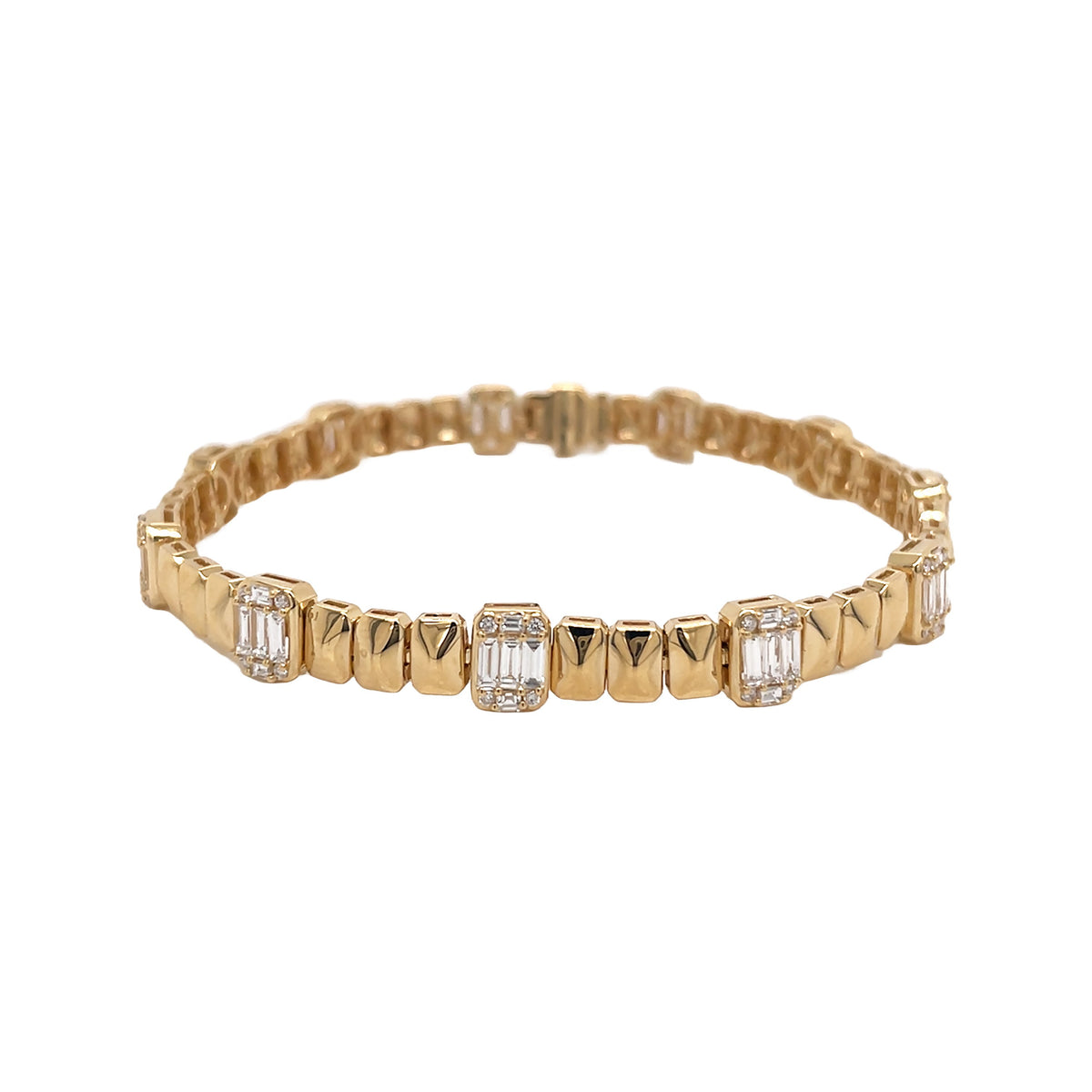 18kt yellow gold micro prong set baguette and round brilliant diamond multi-cluster bracelet.