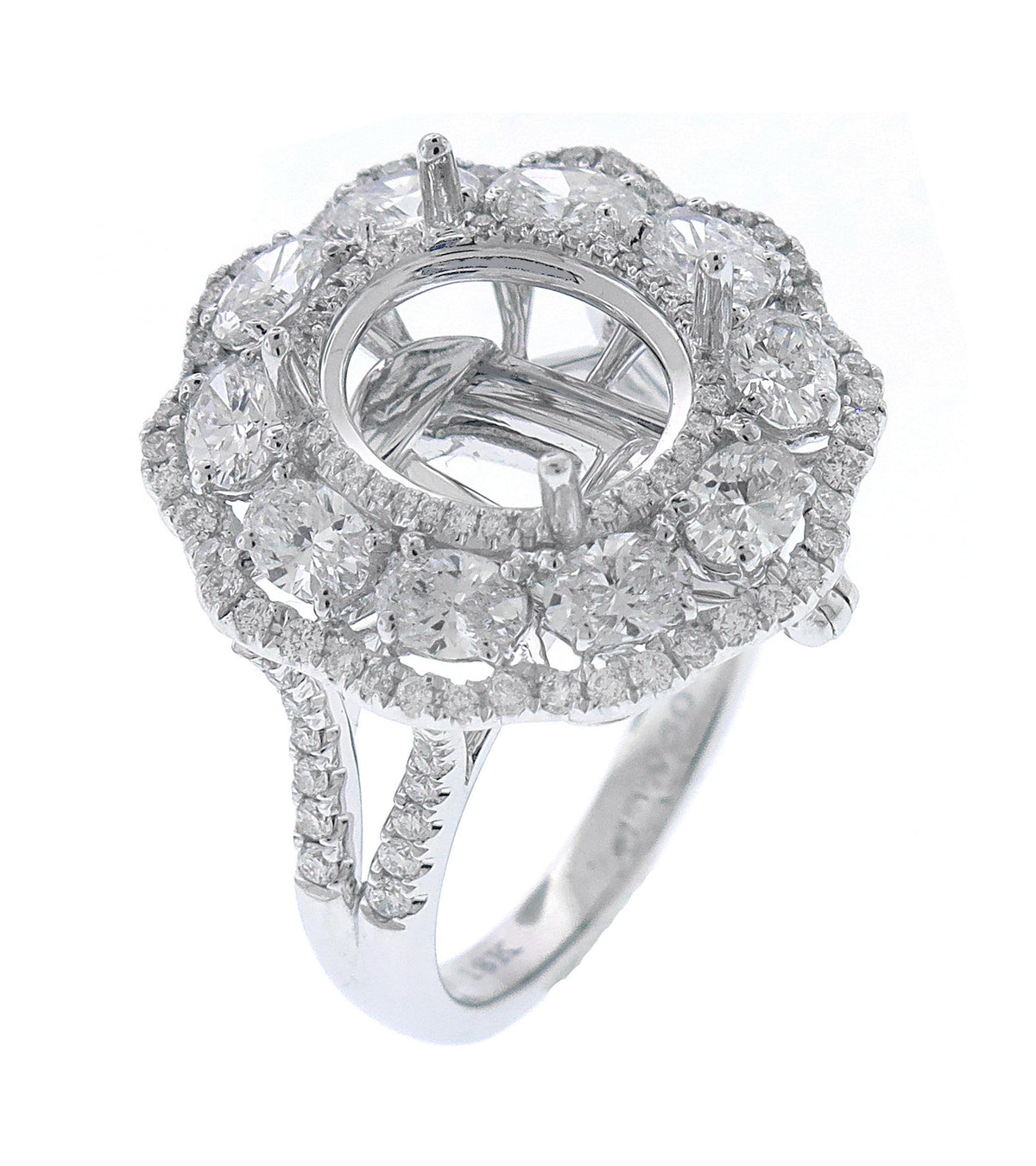 18kt white gold micro pave and prong set round brilliant diamond setting with oval halo and split shank