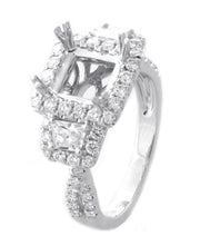 18kt white gold micro prong set round brilliant diamond cushion halo semi mount with prong set trapezoid diamond on each side and twisted shank
