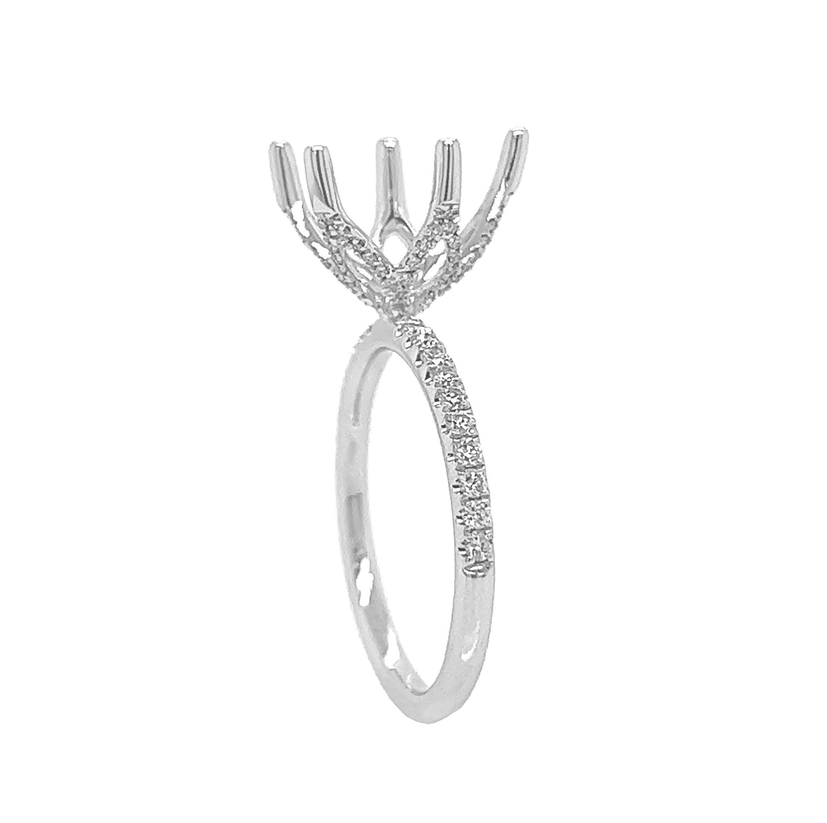 18kt white gold 5 prong pear semi-mount with micro prong set round brilliant diamond on the gallery and shank.