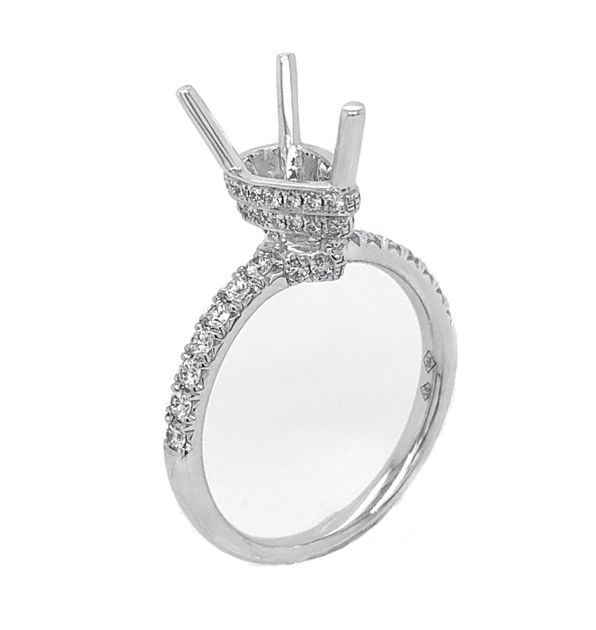 18kt white gold micro prong and micro pave set round brilliant diamond 3 prong set semi-mount for pear diamond with diamonds on gallery and shank.