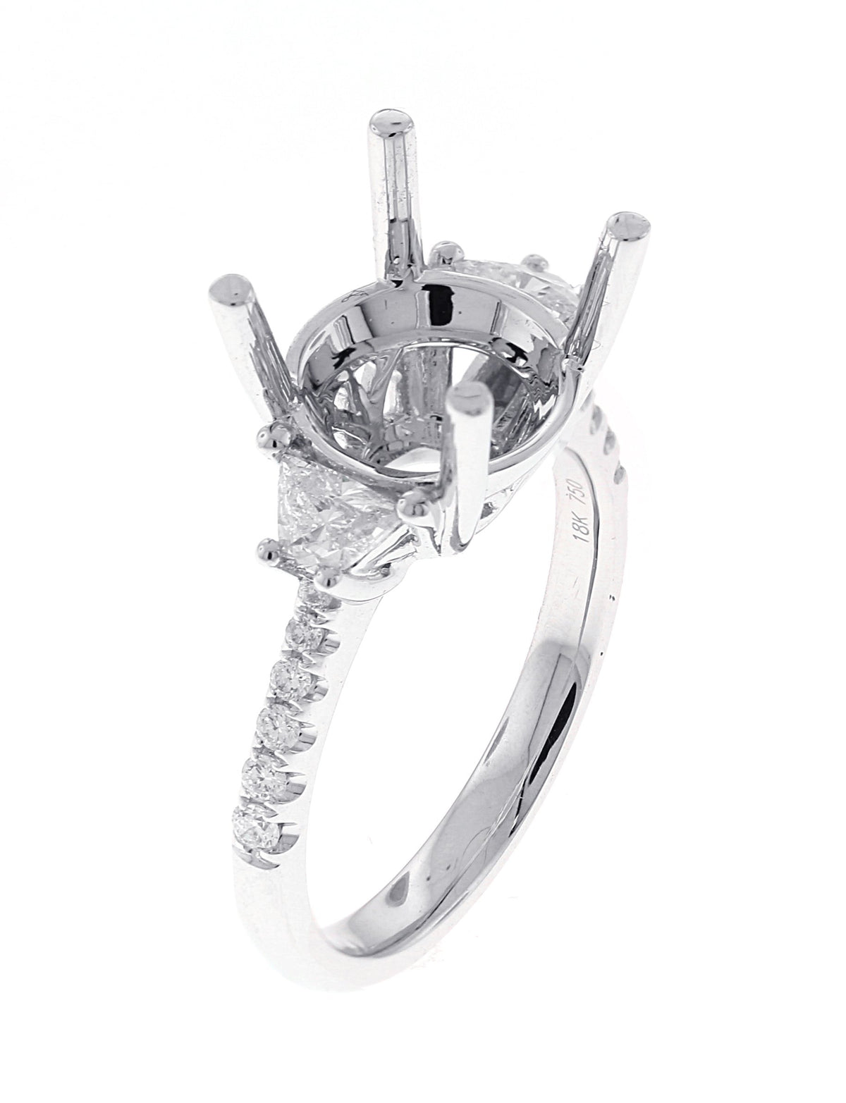 18kt white gold micro prong set round brilliant diamond with prong set baguette diamond semi mount for round diamond.