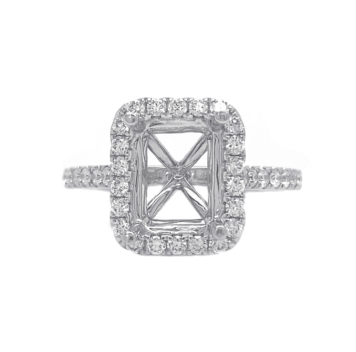 18kt white gold micro prong set round brilliant diamond emerald shaped halo semi-mount with diamonds on the shank.