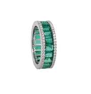 18kt white gold micro prong set round brilliant diamond and channel set green emerald eternity band. 22 green emerald = 3.95ctw 110 round diamonds = 0.71ctw