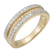 18kt yellow gold micro prong set round brilliant diamond multi-row twisted design band.