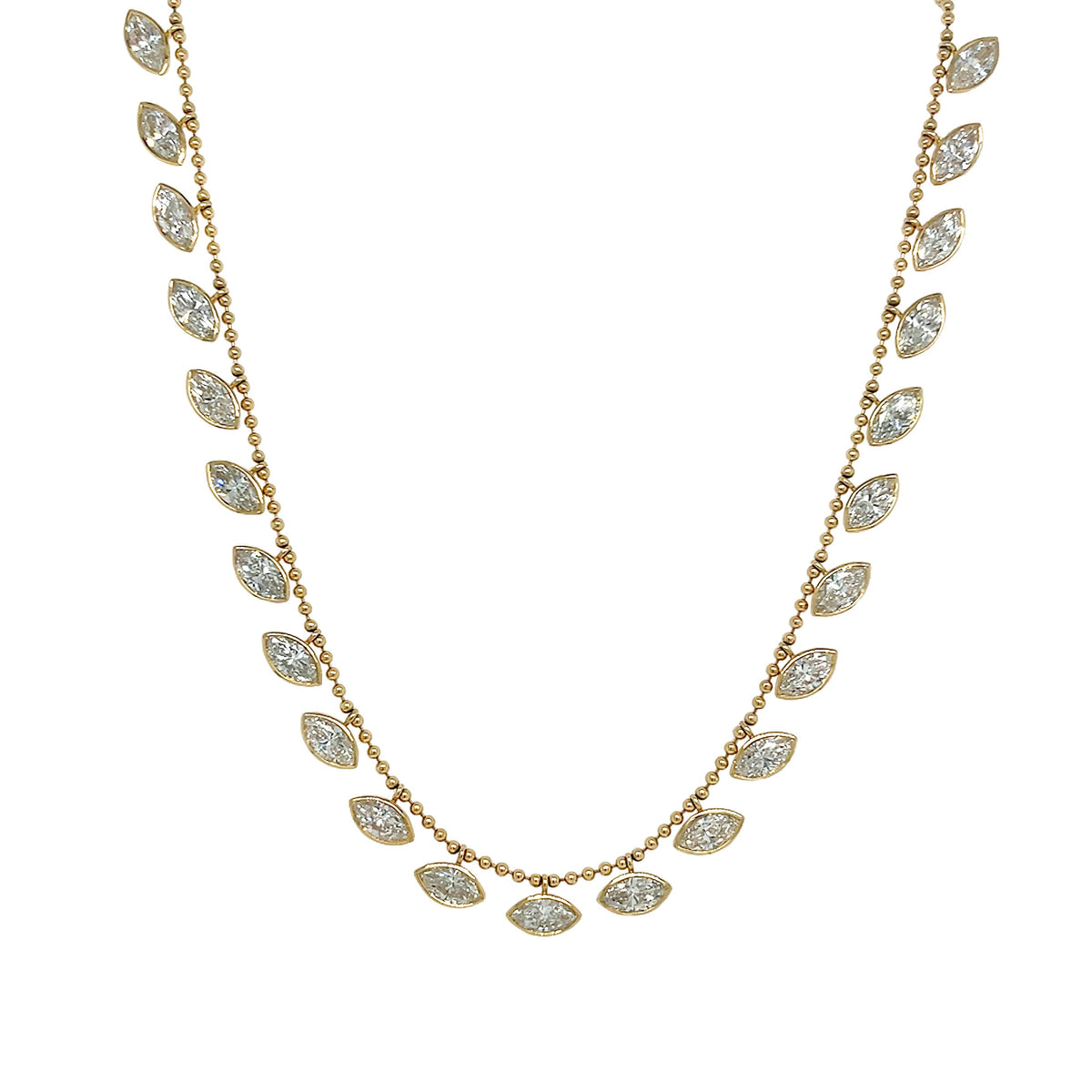 14kt yellow gold bezel set laboratory grown marquise shaped diamond dangling necklace with beaded chain.
