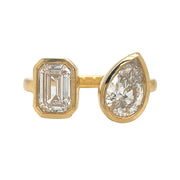 14kt yellow gold bezel set laboratory grown pear and emerald cut diamond open ring.