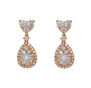18kt rose gold prong and micro prong set round brilliant diamond heart and dangling teardrop earrings.
