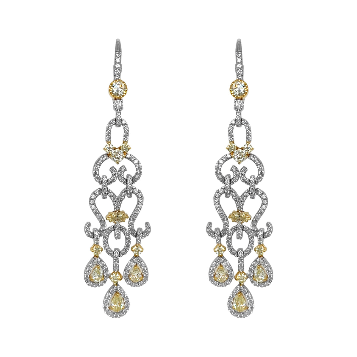 18kt Two tone gold mutual prong set round brilliant diamond with fancy shape yellow diamond danggling earrings