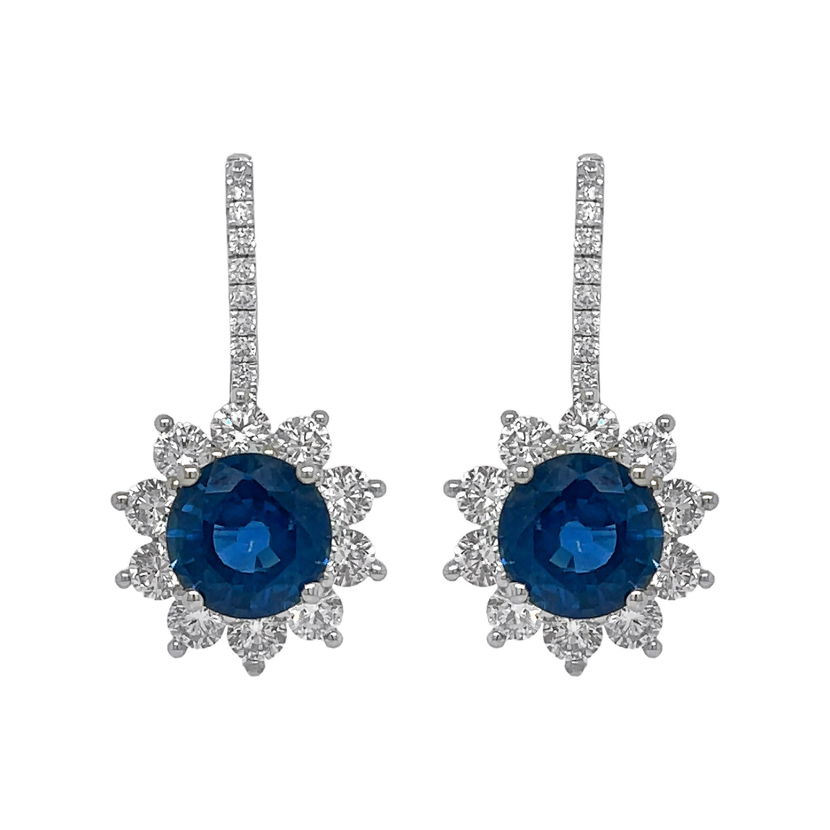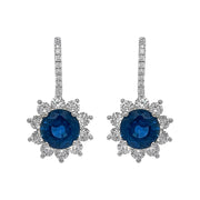 18kt White gold pave and mutual prong set round brilliant diamond earrings (star burst) with blue sapphire in center 2 sapphires = 5.84ctw 20-Diamonds=2.18ctw 18-diamonds=0.18ctw