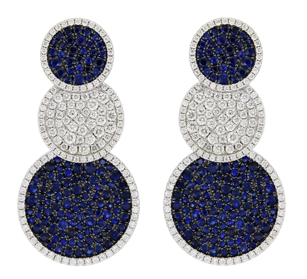 18kt white gold micro pave set blue sapphire and round brilliant diamond multi-cluster earrings. 252 blue sapphires = 3.79ctw 280 round diamonds = 1.86ctw