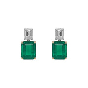 18kt white gold 4 prong set GIA certified emerald cut diamond and green emerald dangling earrings.