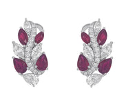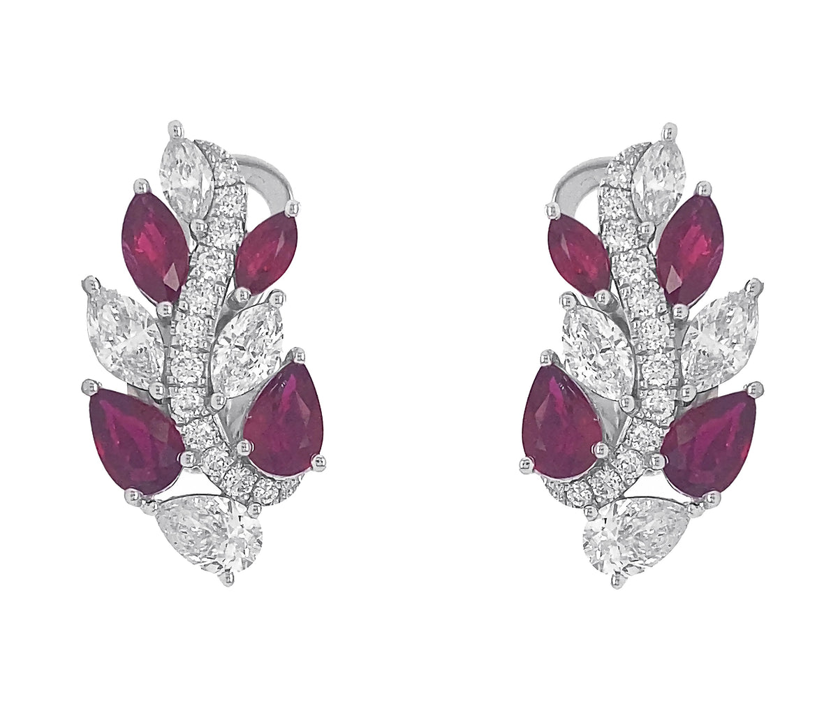 18kt white gold prong set ruby and marquise, pear, and round brilliant diamond earrings.