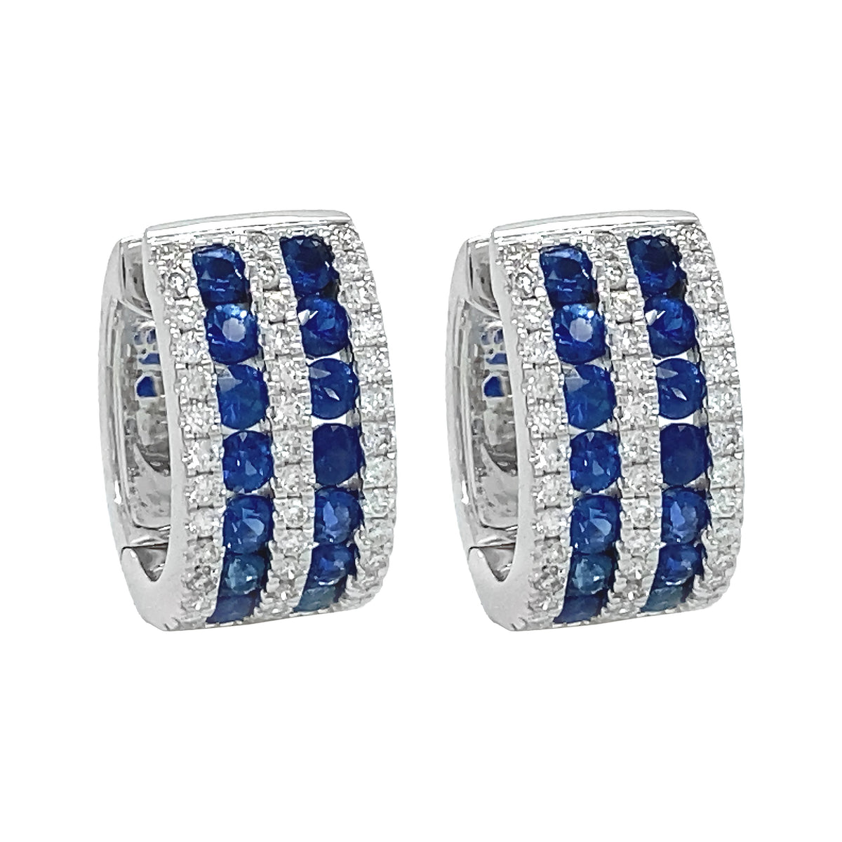 18kt white gold micro prong set round brilliant diamond and blue sapphire multi-row huggie earrings. 28 blue sapphires = 1.24ctw 84 round diamonds = 0.39ctw