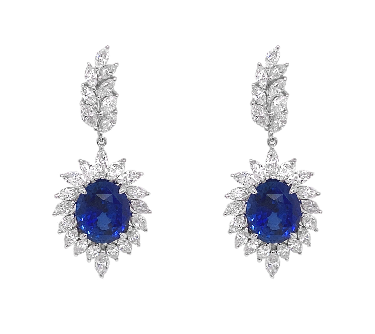 18kt white gold 4 prong set GIA certified oval blue sapphire and prong set marquise diamond dangling earrings.