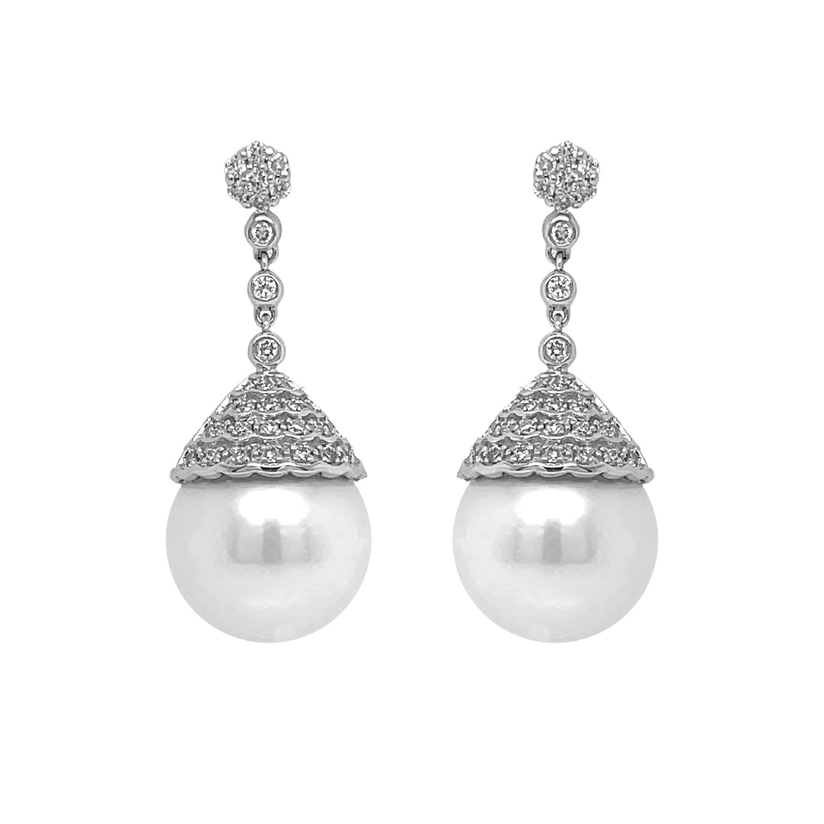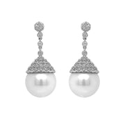 18kt white gold micro prong set round brilliant diamond and south sea pearl dangling earrings. 60 round diamonds = 0.33ctw 2 fresh water pearl: 11.4-11.5mm