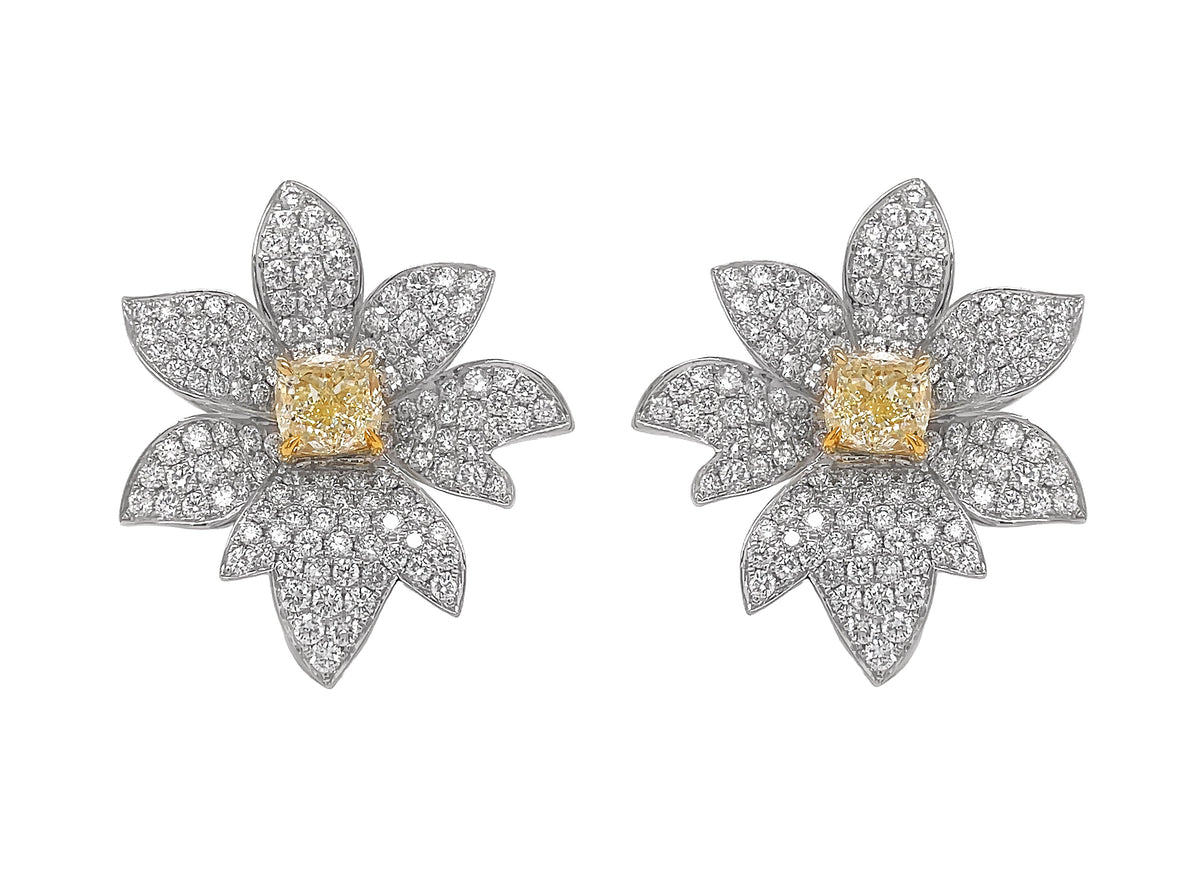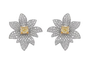 18kt white gold 4 prong set GIA certified yellow diamond and micro pave set round brilliant diamond flower earrings.