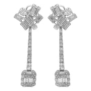 18kt white gold prong and channel set baguette, marquise, princess and round brilliant diamond dangling earrings.