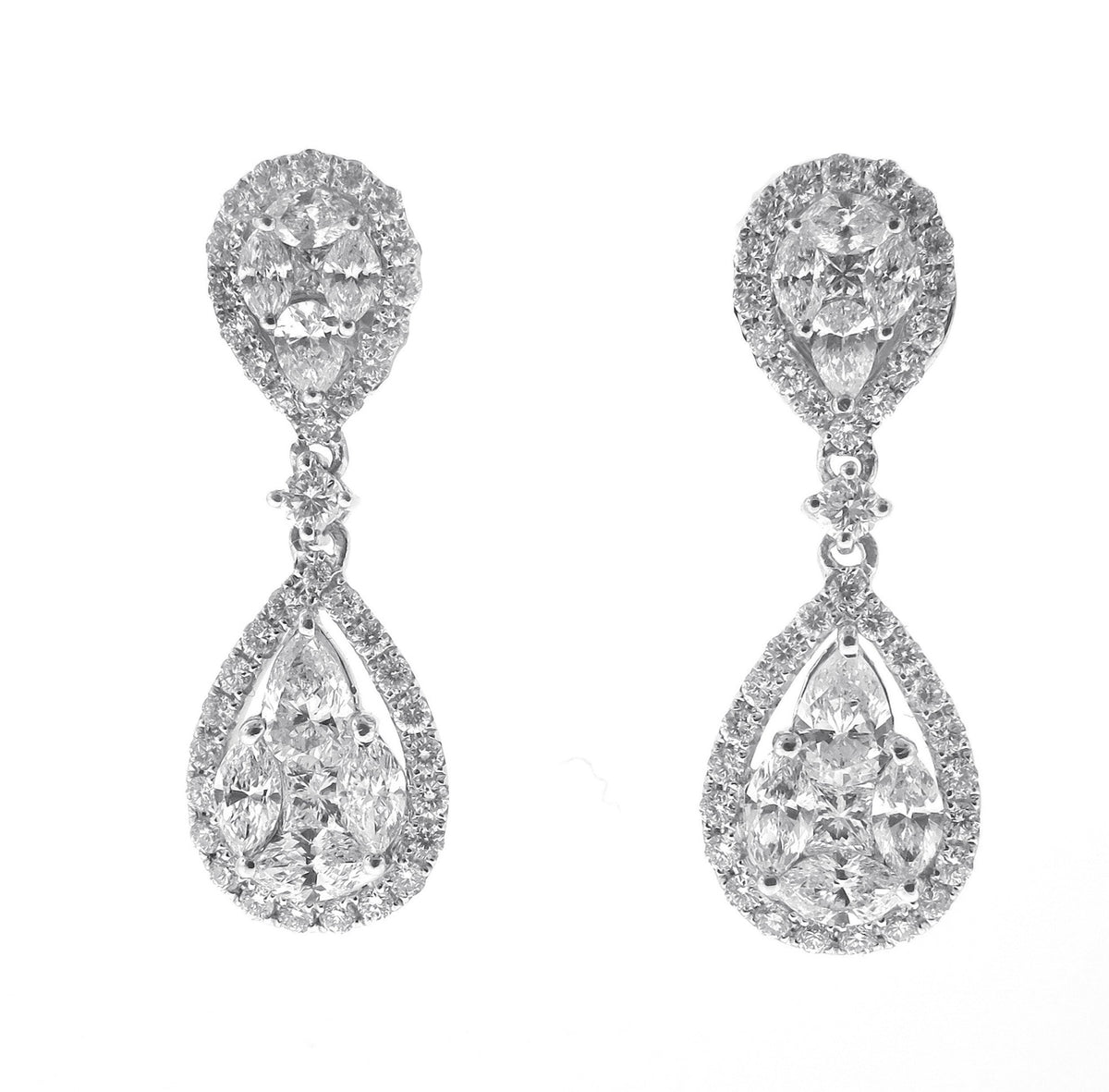 18kt white gold micro prong, prong, and invisible set round brilliant diamond double dangling pear shape earrings