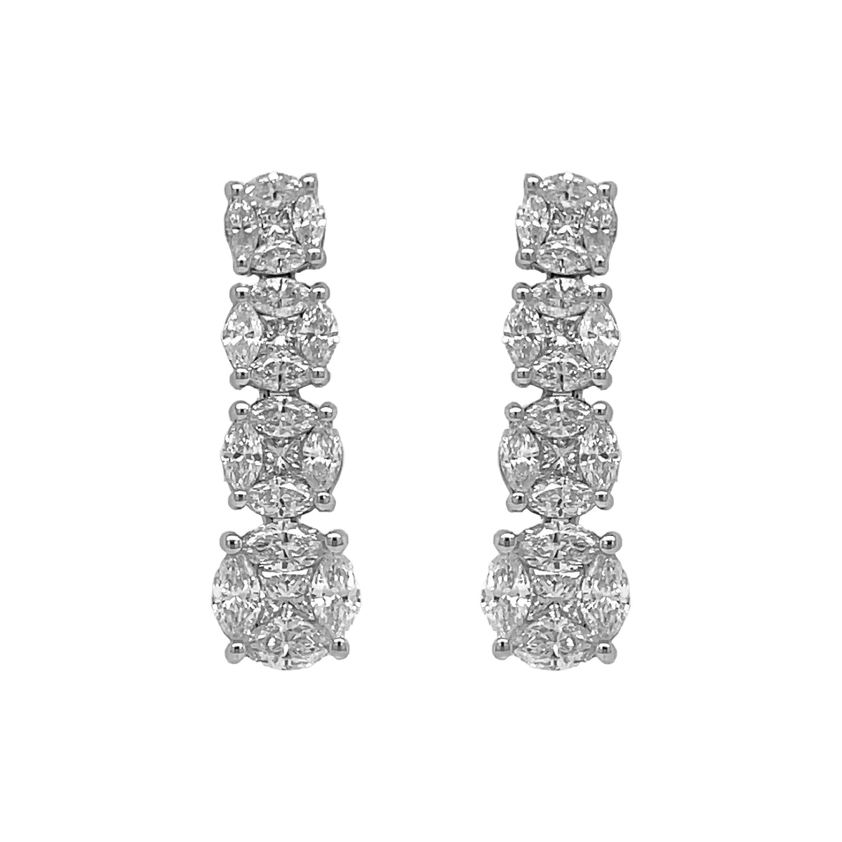 18kt white gold invisible set marquise and princess cut diamond multi-cluter dangling earrings.