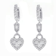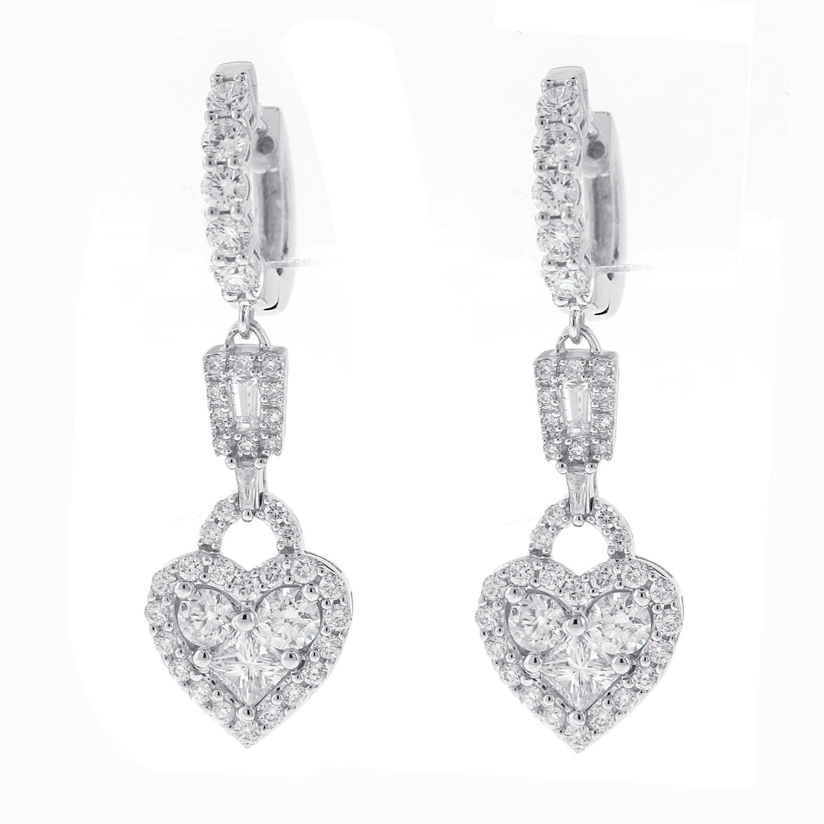 18kt White gold Prong set Princess cut Diamonds, Baguette diamonds and Round Brilliant Diamond dangling Heart Earrings