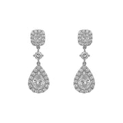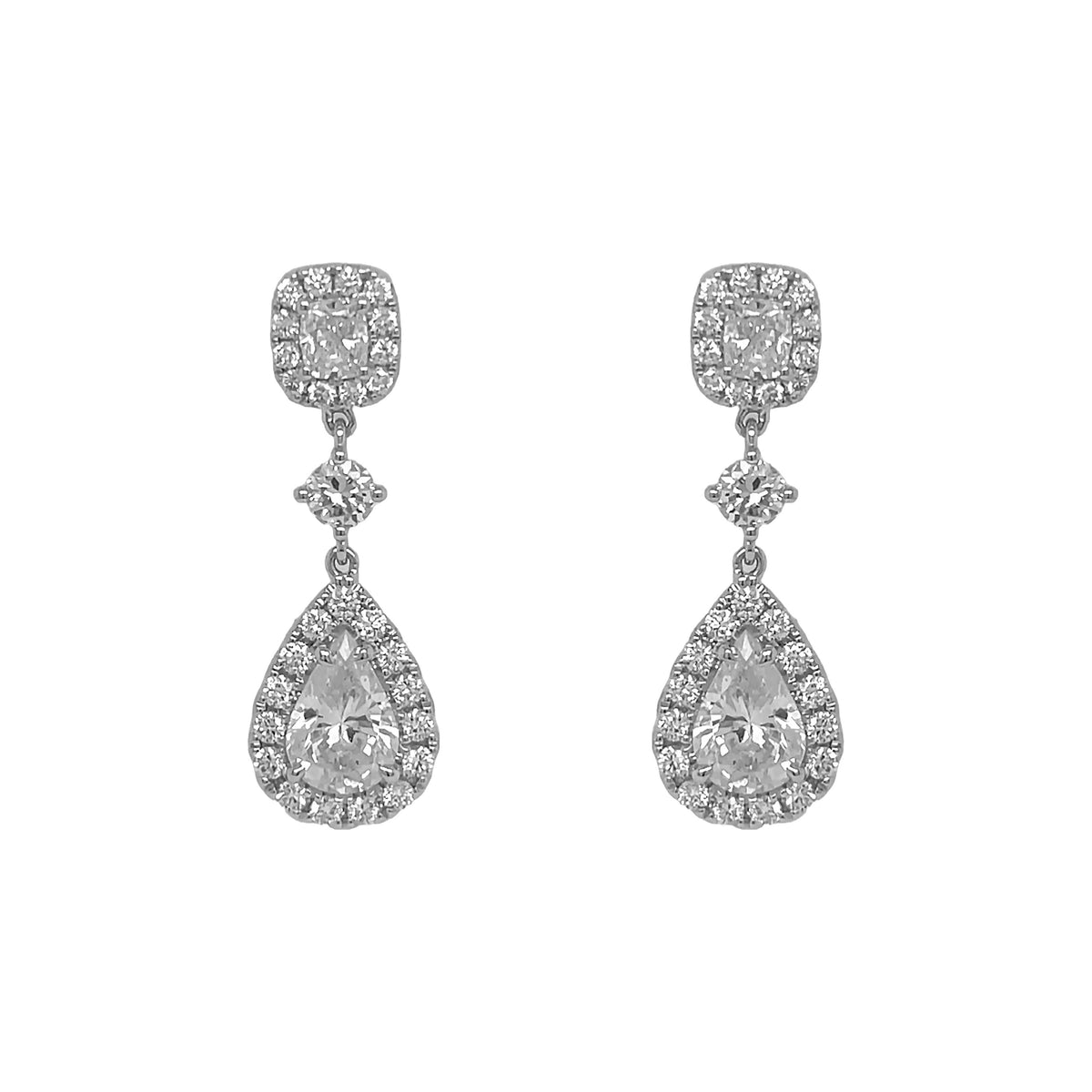 18kt white gold prong set pear, cushion and round brilliant diamond dangling earrings.