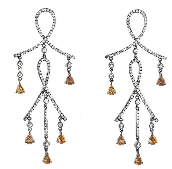 18kt white gold micro prong set and bezel set round brilliant diamond and prong set cognac diamond dangling earrings.