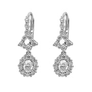 18kt white gold level back diamond earrings with 4 prong set oval cut diamonds on center and prong set round cut brilliant diamonds around.