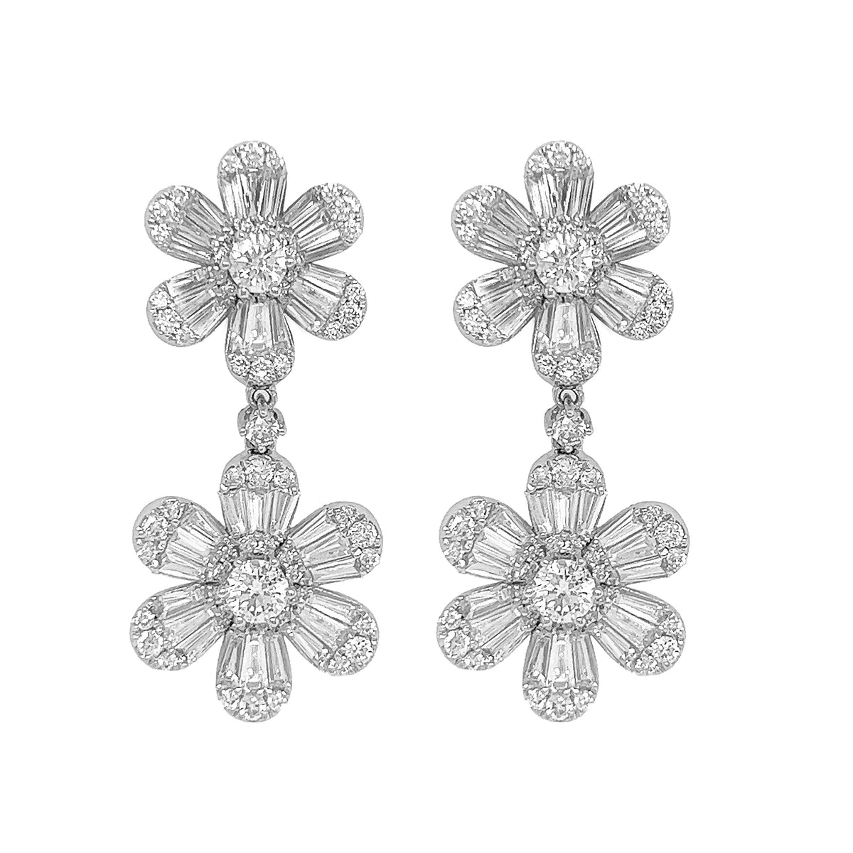 18kt white gold micro prong set baguette and round brilliant diamond dangling flower earrings.