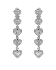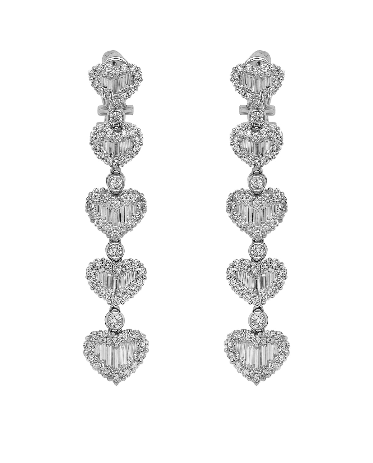 18kt white gold channel set baguette and mutual prong set round brilliant diamond dangling multi-cluster heart earrings.