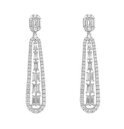 18kt white gold micro prong and prong set baguette and round brilliant diamond dangling earrings.