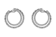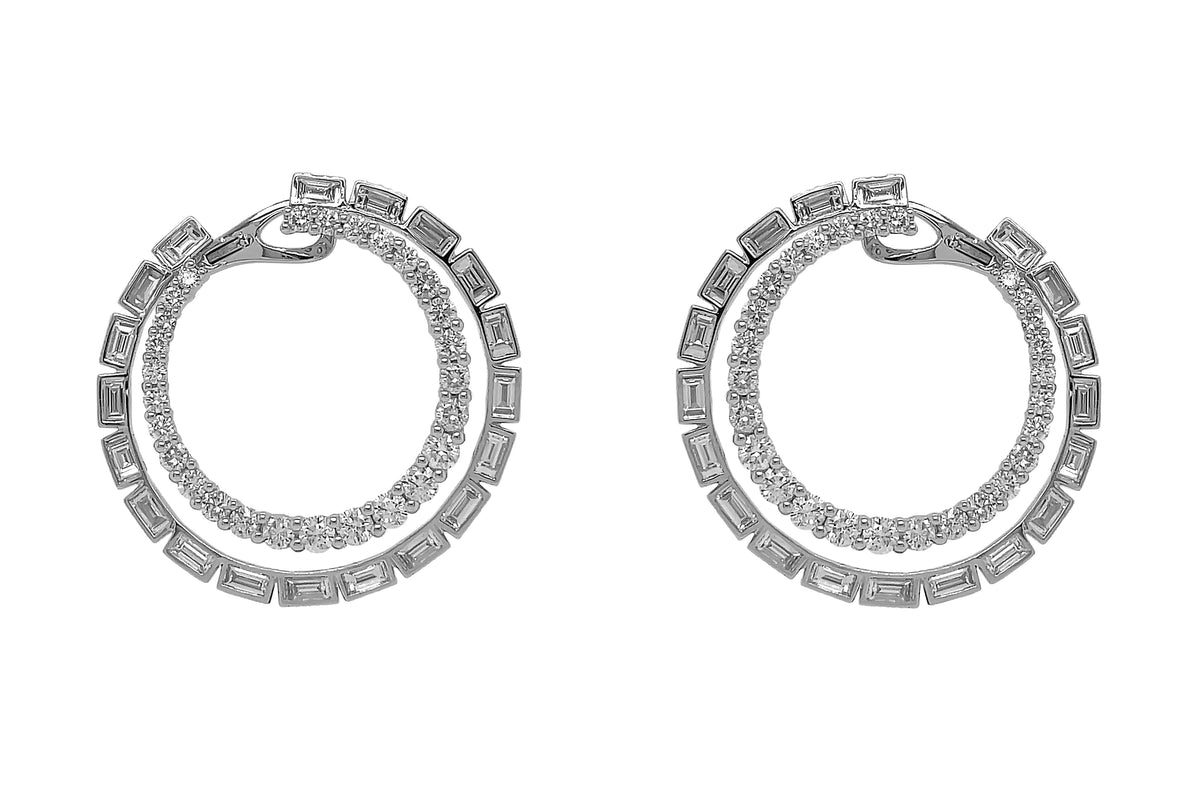 18kt white gold bezel set baguette and mutual prong set round brilliant diamond swirl earrings.