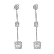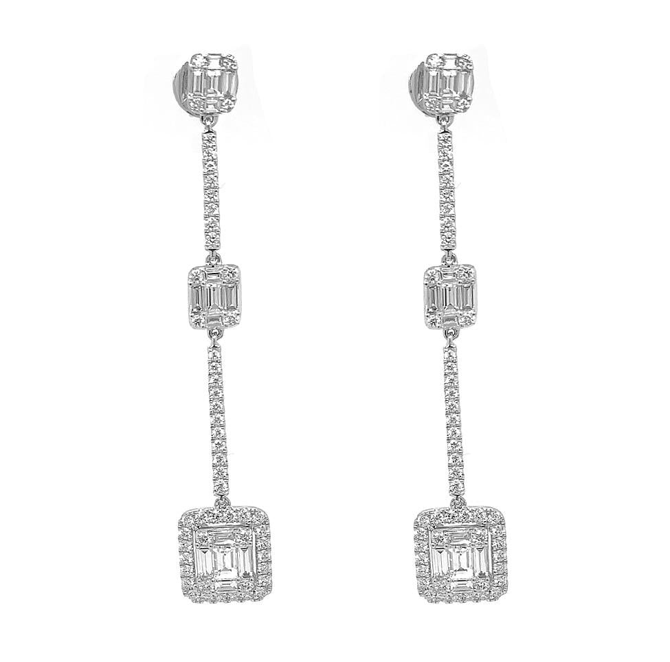 18kt white gold micro prong set round brilliant diamond and prong set baguette diamond dangling multi-cluster earrings.