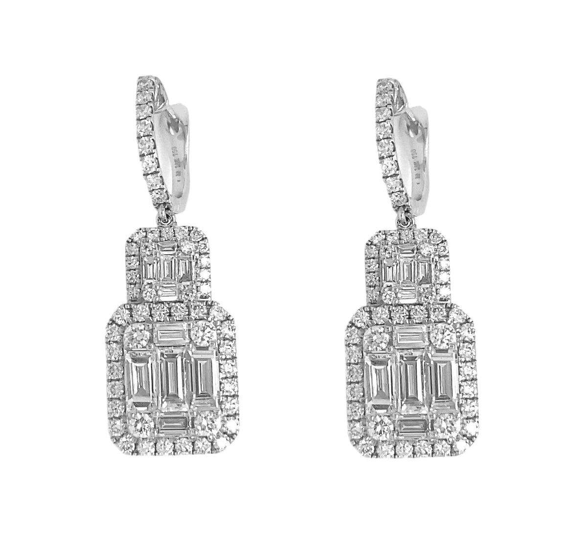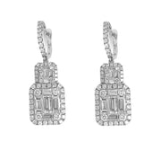 18kt white gold micro prong set baguette and round brilliant diamond dangling earrings.