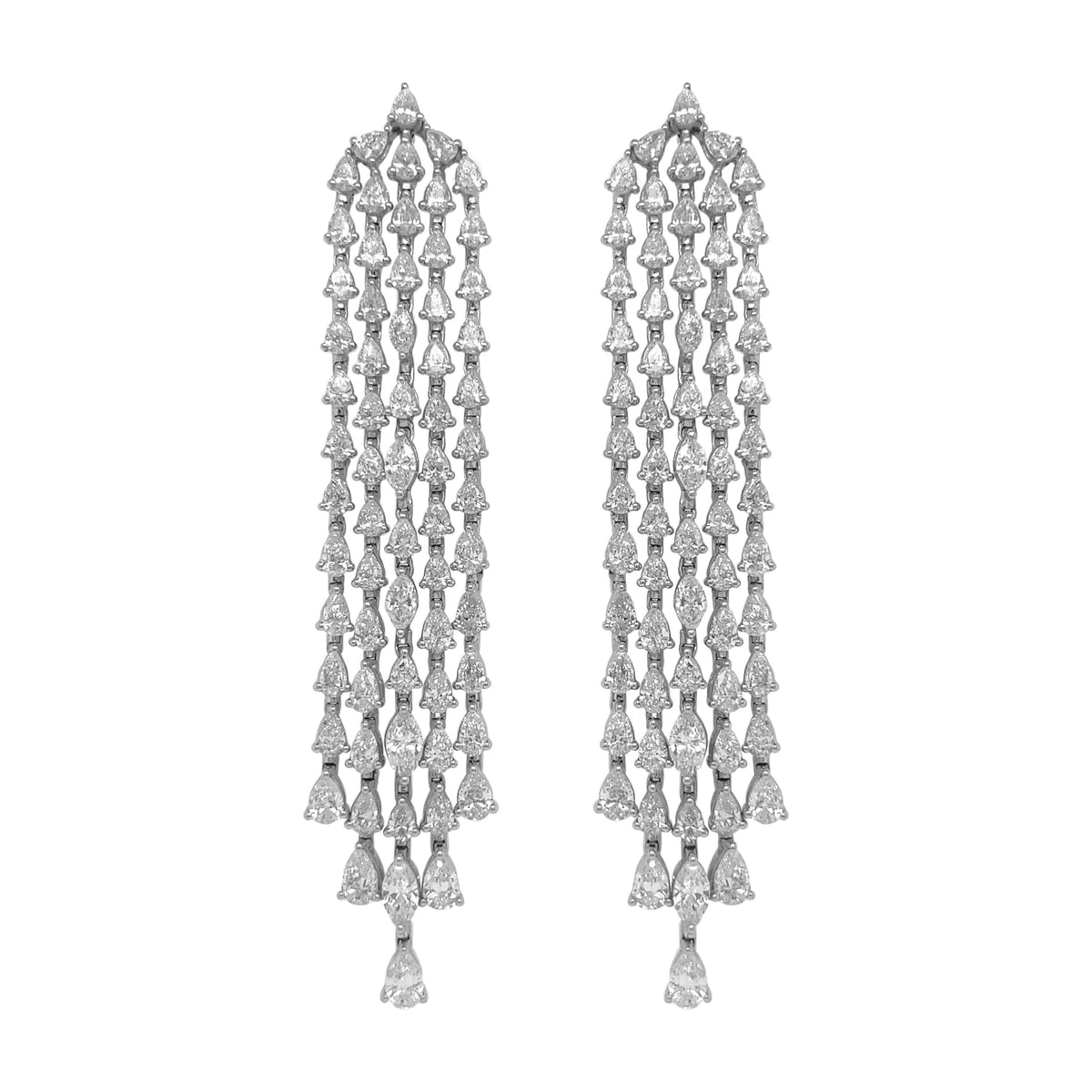 18kt white gold prong set pear and marquise diamond multi-row dangling earrings.