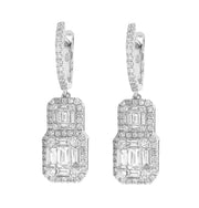 18kt white gold micro prong set baguette and round brilliant diamond dangling double cluster earring.
